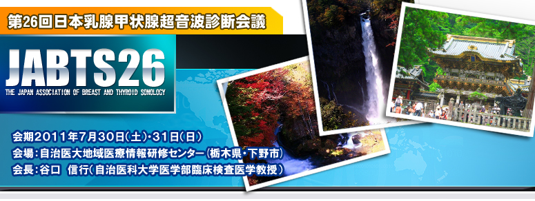 私どもJABTS26事務局では、去る3月11日に発生致しました大地震の影響により、4月に開催予定であったJABTS26を断念いたしました。しかし、その後多くの先生方から励ましと開催に向けてのアドバイスをいただき、検討いたしました結果、本年7月30日(土)と31日(日)に栃木県下野市にあります自治医科大学で第26回日本乳腺甲状腺超音波診断会議を開催することに決定いたしました。この決定に至るまでの経緯につきまして、参加を予定されておられた皆様方にはご心配とご迷惑をおかけしましたことをお詫び申し上げます。